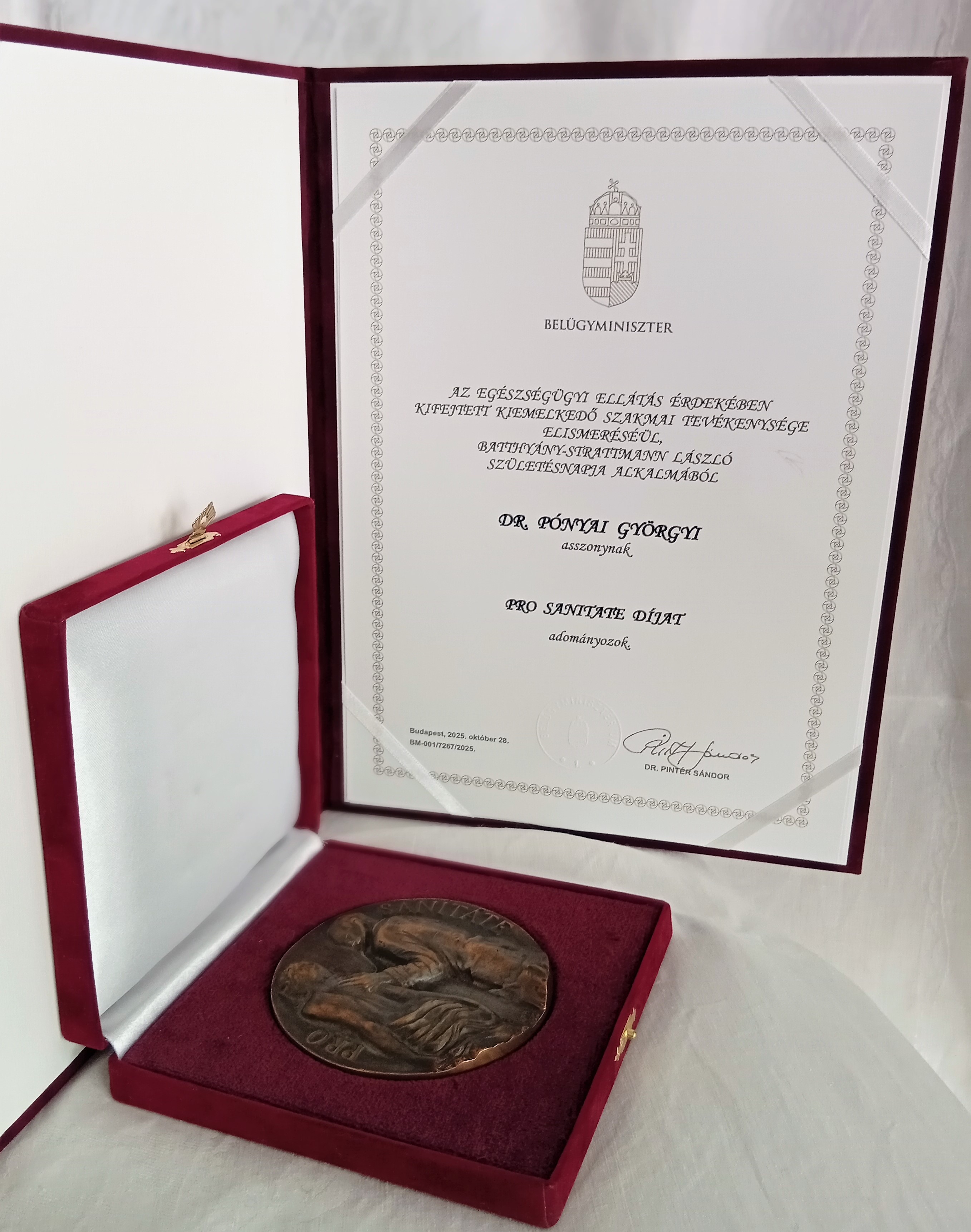 Az egészségügyi ellátás érdekében kifejtett kiemelkedő szakmai tevékenysége elismeréséül, Batthyány-Strattmann László születésnapja alkalmából, dr. Pónyai Györgyi bőrgyógyász, allergo-immunológusnak, a Semmelweis Egyetem Bőr-Nemikórtani és Bőronkológiai Klinika részlegvezető docensének dr. Pintér Sándor belügyminiszter PRO SANITATE díjat adományozott.