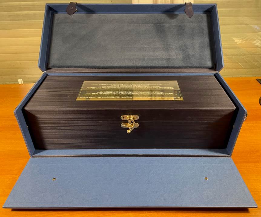 A jogar tartó dobozának tetején lévő sárgaréz lapra az alábbi szöveg került gravírozásra.