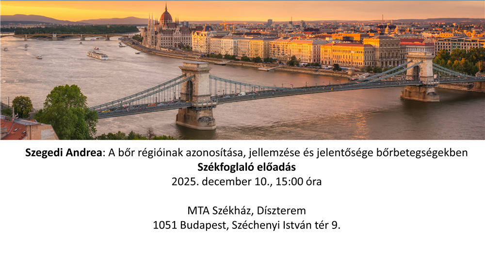 Prof. Dr. Szegedi Andrea az MTA levelező tagja 2025. december 10-én „A bőr régióinak azonosítása, jellemzése ésjelentősége bőrbetegségekben” címmel tartotta meg MTA székfoglaló előadását.