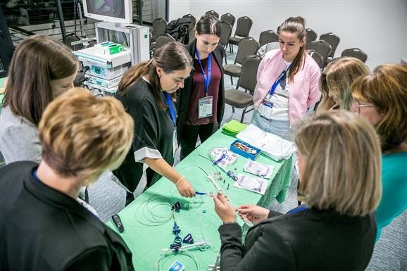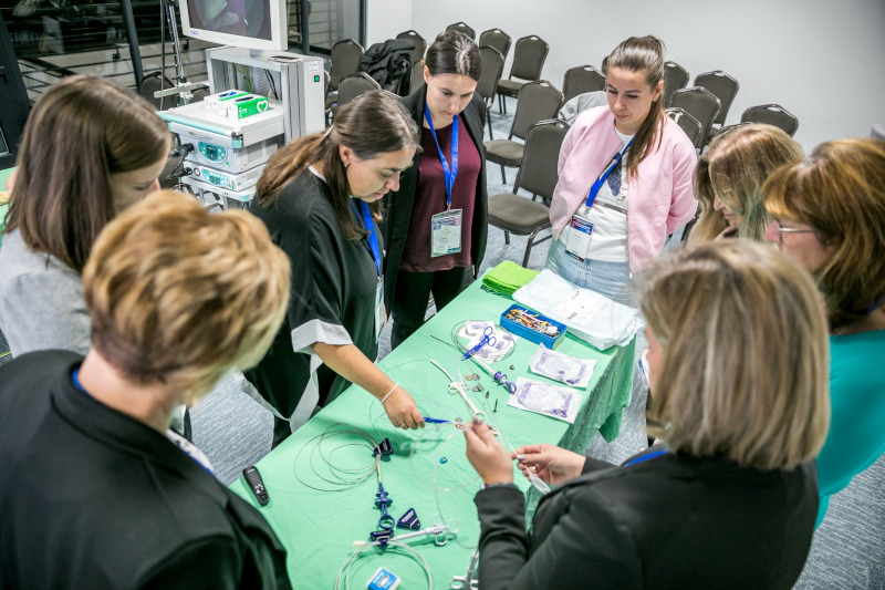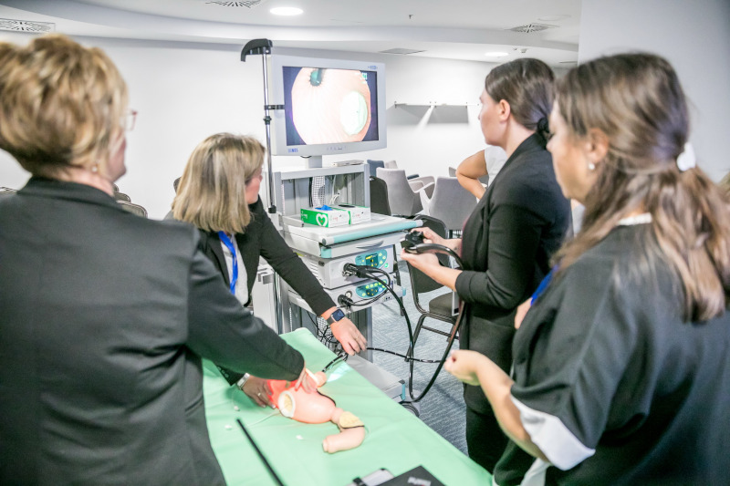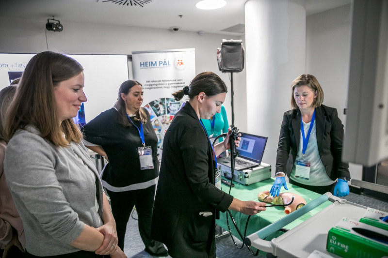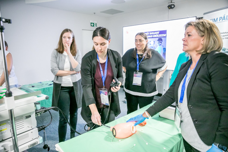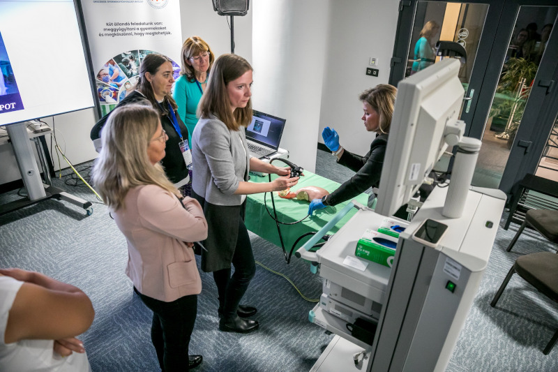 A résztvevők gyakorolhatták a gyomor- és bélrendszeri tükrözést endoszkóp-torony segítségével. Cél, a vizsgálatok diagnosztikus és terápiás jelentőségének bemutatása, valamint a modern eszközök és technikák szemléltetése. A gasztrointesztinális endoszkópia a gyermek-gasztroenterológiai diagnosztika és terápia nélkülözhetetlen eszköze. Lehetővé teszi a nyálkahártya közvetlen megtekintését, célzott mintavételt, valamint számos beavatkozás minimálisan invazív elvégzését. A leggyakoribb indikációk közé tartozik a gastrooesophagealis refluxbetegség, a marószermérgezés, a coeliakia és a gyulladásos bélbetegségek kivizsgálása. Terápiás célból többek között endoszkópos idegentest-eltávolítás, vérzéscsillapítás, illetve polypusok eltávolítása történhet.
