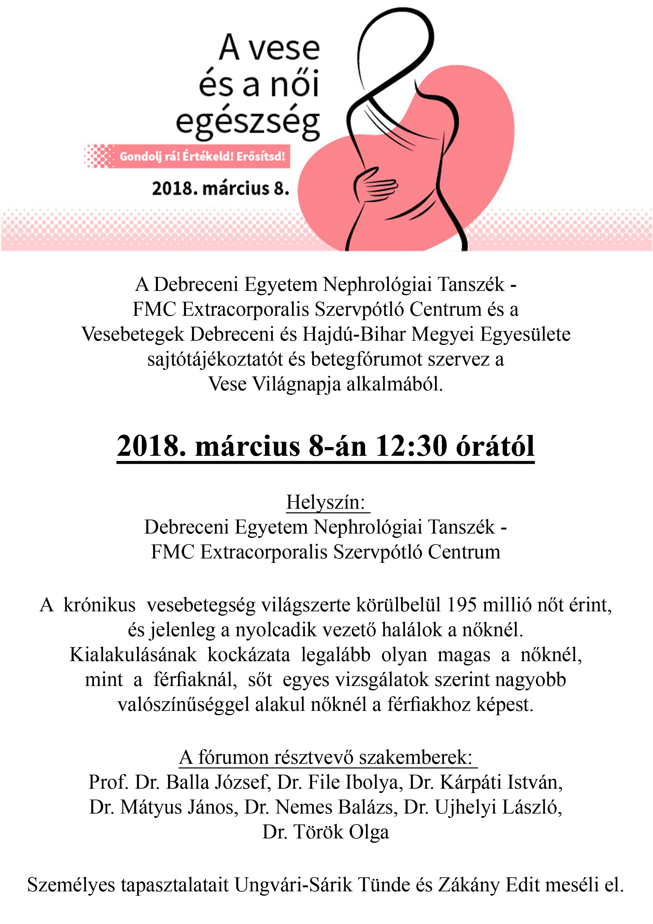 A Debreceni Egyetem Nephrologiai Tanszék, az FMC Extracorporalis Szervpótló Centrum és a Vesebetegek Debreceni és Hajdú-Bihar Megyei Egyesülete sajtótájékoztatót és betegfórumot szervez a Vese Világnapja alkalmából