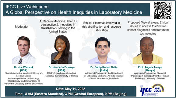 The next IFCC webinar: "A Global Perspective on Health Inequities in Laboratory Medicine" will be held on 11 May, 2022.